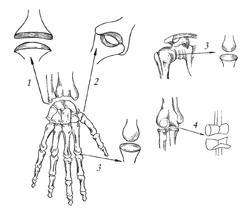 Рис. 3. Формы суставов: 1 – эллипсовидный; 2 – седловидный; 3 – шаровидный; 4 – блоковидный