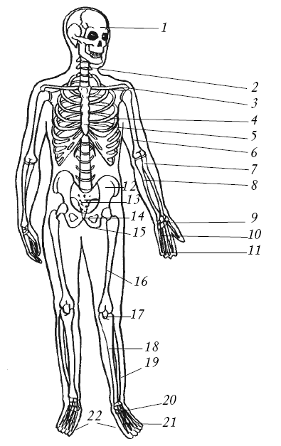Рис. 4. Скелет человека (вид спереди): 1 – череп; 2 – позвоночный столб; 3 – ключица; 4 – ребро; 5 – грудина; 6 – плечевая кость; 7 – лучевая кость; 8 – локтевая кость; 9 – кости запястья; 10 – пястные кости; 11 – фаланги пальцев; 12 – подвздошная кость; 13 – крестец; 14 – лобковая кость; 15 – седалищная кость; 16 – бедренная кость; 17 – надколенник; 18 – большеберцовая кость; 19 – малоберцовая кость; 20 – кости предплюсны; 21 – плюсневые кости; 22 – фаланги пальцев стопы