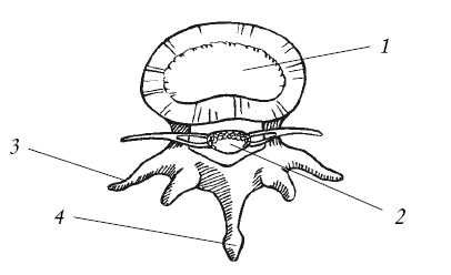 Рис. 6. Позвонок (вид сверху): 1 – тело; 2 – позвоночное отверстие; 3 – поперечный отросток; 4 – остистый отросток