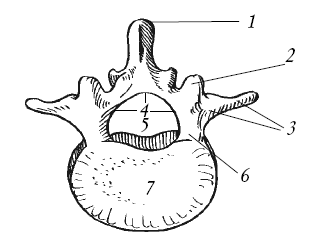 Рис. 8. Поясничный позвонок (вид сверху): 1 – остистый отросток; 2 – верхний суставной отросток; 3 – поперечный отросток; 4 – дуга позвонка; 5 – позвоночное отверстие; 6 – ножка дуги позвонка; 7 – тело позвонка