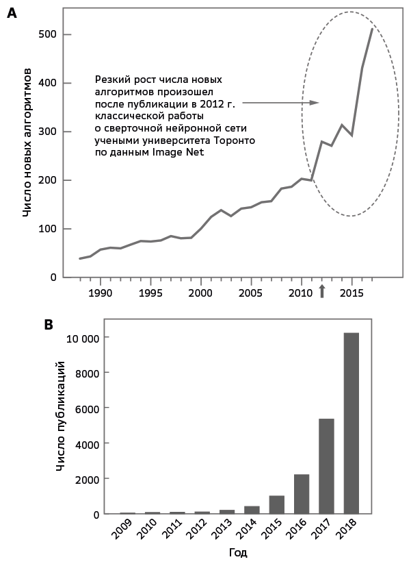 Рис. 1.1. Рост числа алгоритмов глубокого обучения ИИ с 2012 г. после публикации статьи о распознавании образов. Источники: график А приведен с изменениями из: A. Mislove: "To Understand Digital Advertising, Study Its Algorithms." The Economist (2018): www.economist.com/science-and-technology/2018/03/22/to-understand-digital-advertising-study-its-algorithms. График B приведен с изменениями из: C. Mims, "Should Artificial Intelligence Copy the Human Brain?" The Wall Street Journal (2018): www.wsj.com/articles/should-artificial-intelligence-copy-the-human-brain-153355265?mod-searchresults&page-1&pos-1.