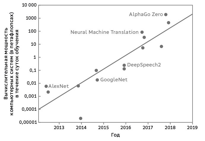 Рис. 1.2. Экспоненциальный рост скорости вычислений — в 300 000 раз — в процессе выполнения различных обучающих ИИ программ. Источник: с изменениями из: D. Hernandez and D. Amodei, "AI and Compute", Open AI (2018): http://blog.openai.com/ai-and-compute.