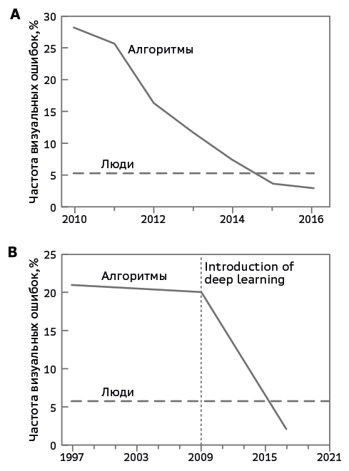 Рис. 1.3. Повышение точности работы машинного искусственного интеллекта с изображениями (А) и речью (В). При работе с упорядоченными базами данных и выполнении узконаправленных задач качество работы искусственного интеллекта выше качества работы человека. Источники: график А с изменениями из: V. Sze et al., "Efficient Processing of Deep Neural Networks: A Tutorial and Survey," Proceedings of the IEEE (2017); 105 (12), 2295–2329. График B с изменениями из: "Performance Trends in AI," Word Press Blog (2018): http://srconstantin.wordpress.com/2017/01/28/performance-trends-in-ai.
