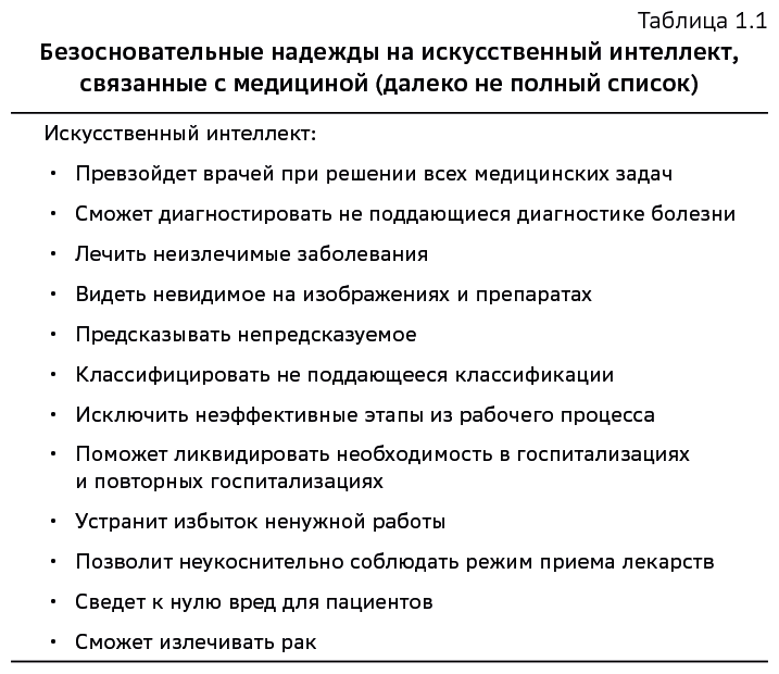 Я не верю, что глубокое обучение искусственного интеллекта сделает его способным лечить все болезни и устранять недостатки современного здравоохранения, но список, приведенный в табл. 1.1, дает представление о том, насколько широко можно использовать этот инструмент и насколько реклама преувеличивает его возможности. Со временем искусственный интеллект поможет нам продвинуться в решении всех перечисленных задач, но это будет марафон без финишной черты.