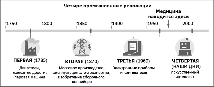 Мы еще в самом начале эпохи искусственного интеллекта; это пока не повседневная медицинская практика, и некоторые скептики называют применение искусственного интеллекта в медицине SiliconValley-dation, намекая, что подобная валидация годится для проектов в Кремниевой долине (SiliconValley), а не для работы с живыми людьми. Такое пренебрежительное отношение распространено в медицине и чрезвычайно замедляет изменения. В результате весь мир уже находится на стадии четвертой промышленной революции, ознаменованной пришествием искусственного интеллекта, а медицина застряла в предыдущей эпохе — на стадии третьей революции, когда только-только начали широко применяться компьютеры и электроника (см. рис. 1.4). Например, файлы MP3 совместимы со всеми моделями музыкальных проигрывателей, а медицине только предстоит освоить удобные в использовании электронные формы медицинской документации, совместимые с различными устройствами. Это наглядный пример того, с каким трудом новое пробивает себе дорогу в этой отрасли.