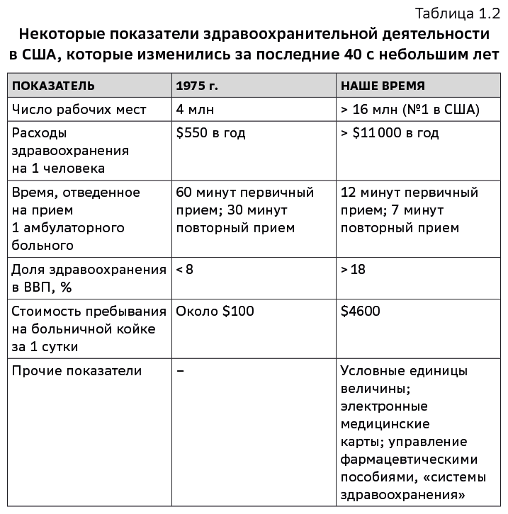 Третья (и наиболее важная) составляющая — это глубокая эмпатия и связь между пациентами и клиницистами. В течение более 40 лет — с момента поступления на медицинский факультет — я наблюдаю неуклонную деградацию гуманистической стороны медицины, что подтверждается данными табл. 1.2. За это время здравоохранение стало не просто крупным, но (к 2017 г.) крупнейшим бизнесом. Теперь система здравоохранения — это самый крупный в США работодатель, обогнавший по числу созданных рабочих мест сети розничной торговли. По приведенным данным видно, что расходы на здравоохранение резко взлетели. Но даже при безудержном росте занятости в этом секторе и при росте расходов на одного пациента резко сократилось время, которое врач может посвятить одному больному, — как на амбулаторном приеме, так и в больницах. Врачи очень сильно загружены. При невероятно высокой стоимости суточного пребывания на больничной койке (около $5000), контакт с врачом может продолжаться всего несколько минут, за что взимается отдельная плата. Поглощенные непосредственным общением с пациентами и их лечением, врачи пассивно взирали на кардинальные изменения в отрасли, касающиеся ведения электронной медицинской документации, «управляемого медицинского обеспечения», медицинского менеджмента и введения RVU — условных единиц величины (каждой из перечня услуг врача присвоена определенная сумма RVU). В наши дни как никогда высок процент врачей и медицинских сестер, которые страдают от профессионального выгорания и депрессии, вызванных неспособностью оказывать пациентам реальную помощь, а ведь именно это было их основной мотивацией, когда они посвятили себя медицине.