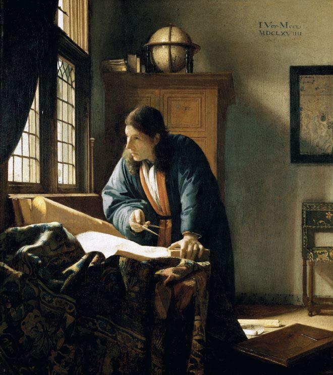 Наш географ тоже пытается разгадать загадку. Он давно думает, рассчитывает, находит, одумывается, замечает, что идет ложным путем… И вот он поднимает голову и поворачивается к свету, устремив взгляд в окно, расположенное слева, как всегда на картинах Вермеера. Он долго размышлял. Им овладело предчувствие, что для его поиска недостаточно науки, труда и ума. Он понимает, что теперь должен впустить в себя нечто интуитивное или эмоциональное. Он догадывается, что решение мучающего его вопроса находится не вовне, не на картах, глобусах или стрелках компаса. В этот момент Истории, когда люди мало-помалу перестают верить в то, что рай находится на Земле или на небе, вермееровский географ смутно ощущает, что этот рай, путь к которому он ищет, существует в нем самом…