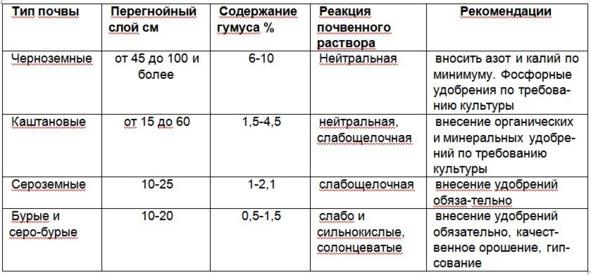 По содержанию гумуса почвы разделяются в основном на черноземные, каштановые, сероземные, бурые и серо-бурые.