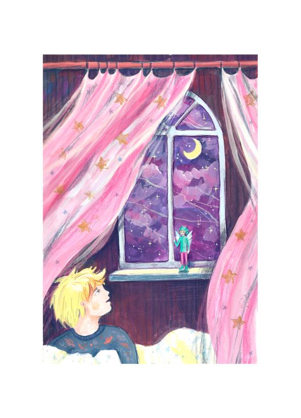 — Привет! Посмотри на верх окошка! Только не пугайся, я добрый. Я твой эльф домашних окон. Мне очень понравились человечки, которых ты сегодня рисовал. Я даже подумал, что ты рисовал меня.