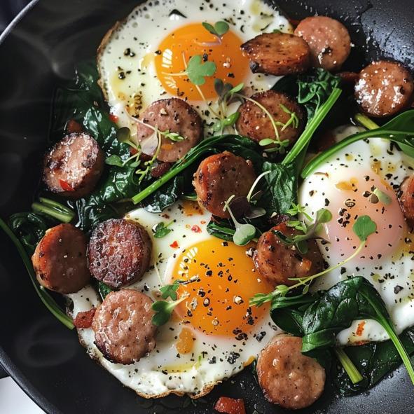 2. Кето Яичница с Колбасой и Шпинатом