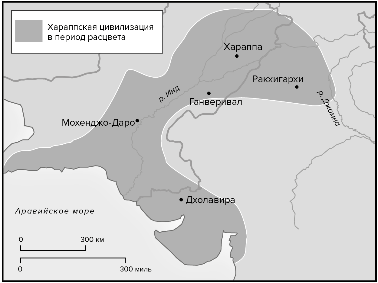 Карта, отображающая границы развитой хараппской цивилизации, также известной как цивилизация долины Инда. Первое название было дано по первому месту ее открытия и сейчас считается предпочтительным, поскольку эта цивилизация простиралась за пределы долины Инда