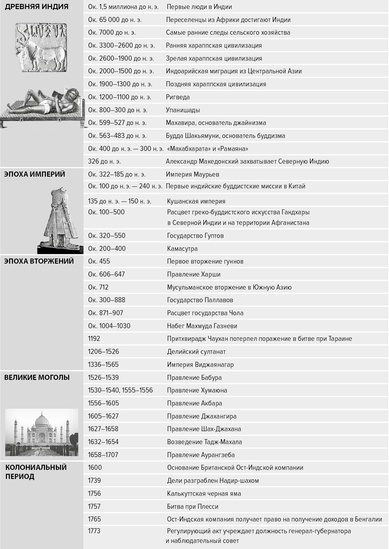 Если зафиксировать здесь правление всех властителей субконтинента, судьбы всех его династий — больших и малых, — исход каждой битвы за землю и богатства, не говоря уже о мировом вкладе Индии в таких сферах, как наука, литература и искусство, получится бессмысленная мешанина имен, дат и утверждений, безо всякой глубины и структуры. Не так-то просто собрать 5000 лет индийской истории в пару сотен страниц, пытаясь отразить все тонкости, но я рискну это сделать.