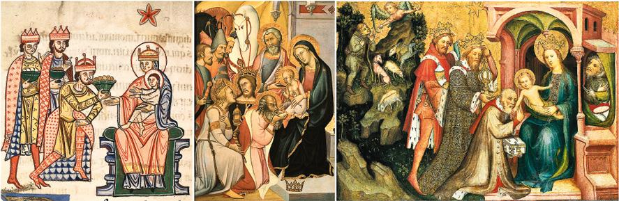 Поклонение волхвов — один из главных сюжетов христианской иконографии. От Средних веков до нас дошли тысячи его версий — от рельефов на слоновой кости и книжных миниатюр до витражей и фресок (рис. 2). Что в нем может быть неожиданного? Три волхва — или, как тогда чаще всего говорили, «короля» — с Востока вслед за чудесной звездой прибыли c дарами к новорожденному мессии (Мф. 2:9–11). Богословы видели в этом событии реализацию пророчества Исайи «и придут народы к свету твоему, и цари — к восходящему над тобою сиянию» (Ис. 60:3). Считалось, что в лице волхвов, представлявших три известные в Средние века части света (Европу, Азию и Африку), все народы склонились перед Царем небесным.