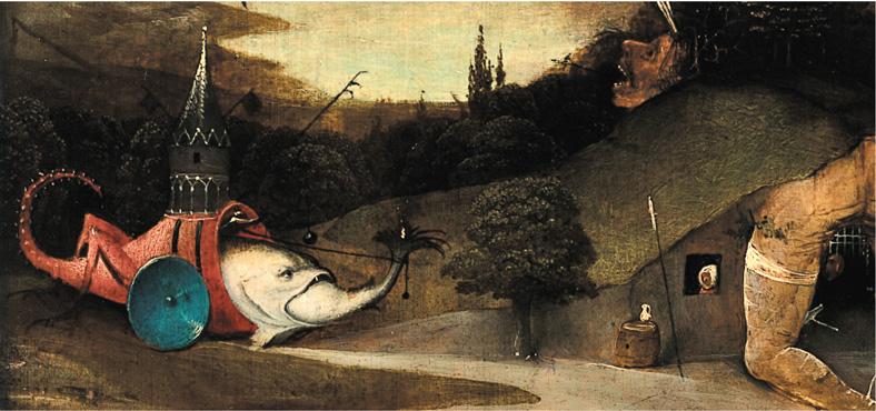 Но что значат оставшиеся детали: ножки и хвост насекомого, синий вогнутый щит, на котором это сооружение может катиться, стоящая у него наверху готическая часовня и, наконец, демон (а может быть, человек), который с помощью веревки заталкивает мелкую рыбину в пасть большой? Важно ли, что хвост этого фантастического создания похож на скорпионий? Ведь в средневековых текстах скорпионы часто олицетворяли дьявола и иноверие, а в житии св. Антония говорилось, что демоны осаждали аскета в образах разных зверей и гадов: львов, леопардов, змей, ехидн и скорпионов. На спине монстра стоит часовенка. Потому некоторые исследователи предполагают, что вся эта дьявольская конструкция изобличала алчность духовенства… Подобные толкования могут звучать убедительно или совершенно фантастично. Но они всегда подразумевают, что у Босха каждая деталь наделена смыслом, а каждый образ устроен как визуальный ребус. А это абсолютно не очевидно. Многие детали явно требовались для того, чтобы вызвать у зрителя изумление или страх, напомнить ему о хитрости дьявола и изменчивой многоликости зла, но сами по себе ничего не значили.