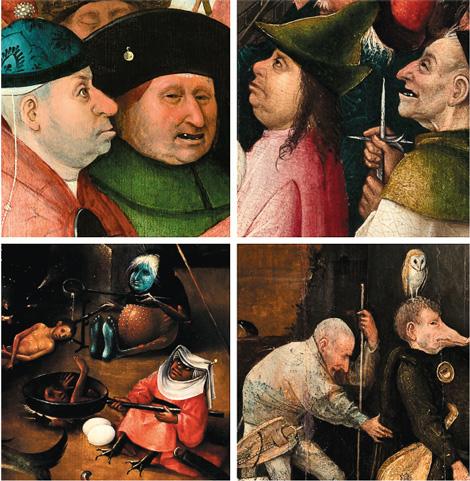 Рис. 6. Иероним Босх. Лица демонов и грешников — фрагменты панелей «Несение креста» (Эскориал), «Се человек» (Франкфурт), «Страшный суд» (Вена), «Искушение св. Антония» (Лиссабон).