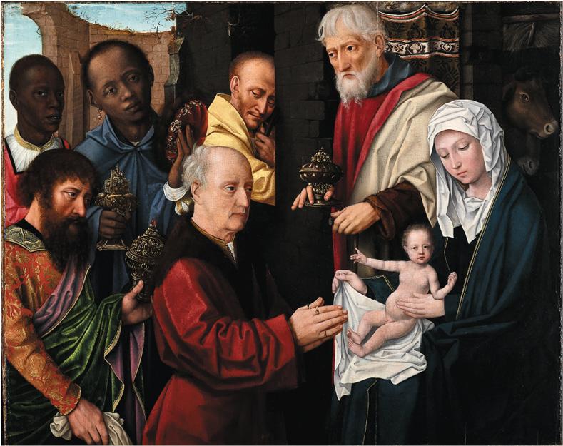 В самом конце XV в. богатые бюргеры из Антверпена — Петер Схейве, который одно время был старшиной местной корпорации ткачей, и его жена Агнес де Грамме заказали триптих с изображением трех волхвов, принесших дары младенцу Иисусу (рис. 1)1. По бокам от центральной сцены художник, как тогда было принято, изобразил самих заказчиков. Опустившись на колени и сложив ладони в жесте молитвы, они смотрят на новорожденного Спасителя и становятся «свидетелями» одного из важнейших моментов в истории Церкви. За Петером стоит его святой патрон — апостол Петр, а за его женой — мученица Агнесса2.