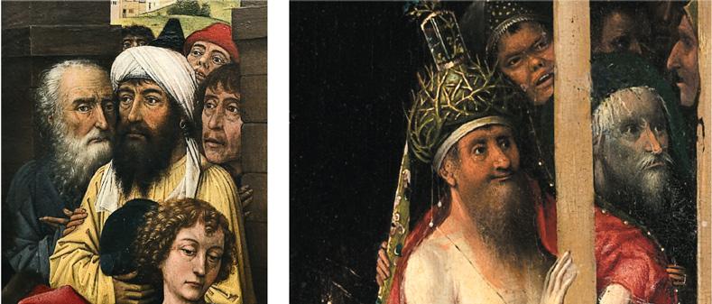 Йерун ван Акен был необычайно изобретателен в изображении дьявола, грешников и всего мира зла. В его сценах Страстей, не говоря уже об инфернальных пейзажах, собраны почти все приемы и знаки, с помощью которых североевропейские мастера его времени и предшествующих столетий демонизировали врагов Христа и христианства (рис. 6). Мы видим и зловеще-темные лица, и крючковатые носы, и зверские гримасы, и восточные одежды, и фантастические гербы с жабами или скорпионами, которые соотносили иноверцев и грешников с их «отцом» — дьяволом. При этом, обличая зло в его бесконечных формах, Босх создал собственный визуальный «диалект», который для нас далеко не всегда понятен.