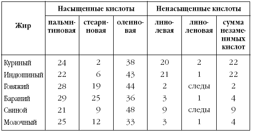 Содержание жирных кислот в различных жирах