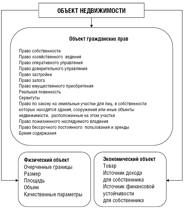 Любой объект недвижимости существует в единстве физических, экономических и правовых свойств, каждое из которых может выступать в качестве определяющего в зависимости от складывающейся ситуации, целей и стадии анализа. Сущность объектов недвижимости заключается в триединстве категорий: материальной (физической), правовой и экономической.