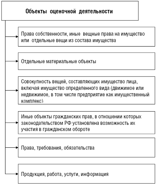 Объект оценки — любой объект собственности в совокупности с правами, которыми наделен его владелец; организация, предприятие, отдельные виды материальных и нематериальных активов (рис. 1.2).