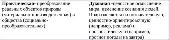 1. Духовно-теоретическая — производство духовных ценностей и благ (мысли, идеи, научные теории, художественные образы).