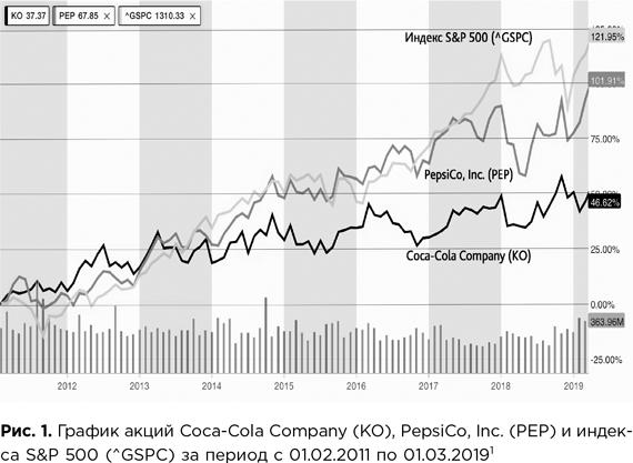 Результаты очень интересные. Почти за восемь лет акции Coca-Cola выросли на 46,6%, а бумаги ее конкурента PepsiCo — вдвое больше: на 101,9%. Но обе компании заметно отстали от остальных: индекс широкого рынка США S&P 500 за это время прибавил 122%.