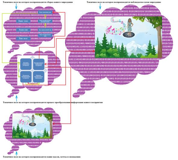 На этом изображении вы можете наблюдать механизмы восприятия придуманного мира, который был создан на основе первичной зрительной и слуховой галлюцинации. Вы создали свой придуманный мир на основе материи вашей привычной сборки мироздания. В этом мире вы создали воображаемые элементарные частицы и физические поля. Вы создали физические законы, позволяющие вам создавать компактные галактики, а законы гравитации вашего придуманного мира позволяют вам и вашей галактике находиться в воздушном пространстве вашей планеты. В своём придуманном мире вы создали придуманные леса и горы, а также своё воображаемое тело. Вы построили своё воображаемое тело из придуманной материи, но вы не наделили своё тело привычными системами восприятия. В своём придуманном мире вы создали воображаемые глаза и уши, размещённые на вашем воображаемом теле, но вы не наделили их возможностями видеть и слышать. Вы создали своё воображаемое тело чисто с эстетическими целями и ваше воображаемое тело не несёт какого-либо функционального значения в вашем придуманном мире. На самом деле вы могли создать воображаемое тело с реальными системами восприятия и головным мозгом, но вы не посчитали это целесообразным действием. Вы посчитали необходимым наблюдать за своим придуманным миром посредством своего тензичного восприятия. Вы создали придуманный мир на основе депликатного программного кода своей сборки мироздания, а потом наложили на него красивые иллюзии геометрии, цвета и звучания.