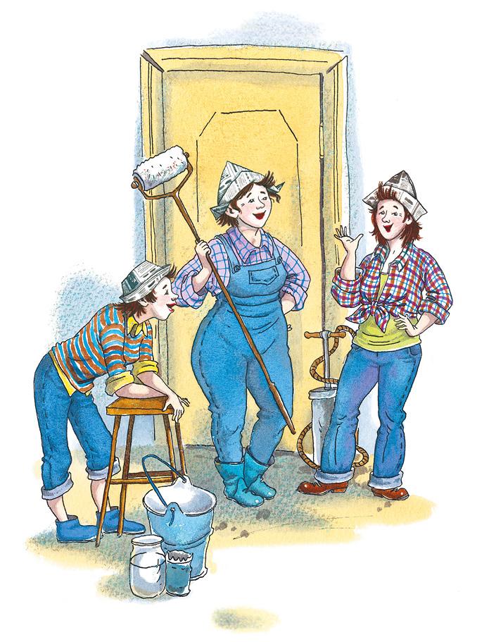 И вместо дяди Гриши во двор пришли три девушки. Они все были очень красиво одеты: носили мужские длинные штаны, измазанные разными красками и совершенно твёрдые. Когда эти девушки ходили, штаны на них гремели, как железо на крыше. А на головах девушки носили шапки из газет. Эти девушки были маляры и назывались: бригада. Они были очень весёлые и ловкие, любили смеяться и всегда пели песню «Ландыши, ландыши». Но я эту песню не люблю. И Алёнка. И Мишка тоже не любит. Зато мы все любили смотреть, как работают девушки-маляры и как у них всё получается складно и аккуратно. Мы знали по именам всю бригаду. Их звали Санька, Раечка и Нелли.