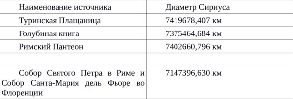 Наиболее крупный диаметр Сириуса в наших изысканиях зашифрован в Туринской Плащанице, в ее длине. Наименьший диаметр кристаллической сферы кристаллов Кремния Сириуса зашифрован в размере ширины купола Собора Святого Павла в Риме и Соборе Санта-Мария дель Фьоре во Флоренции. Поэтому собранные в таблицу воедино все доступные расшифрованные источники о диаметре Сириуса в динамике выглядят следующим образом: