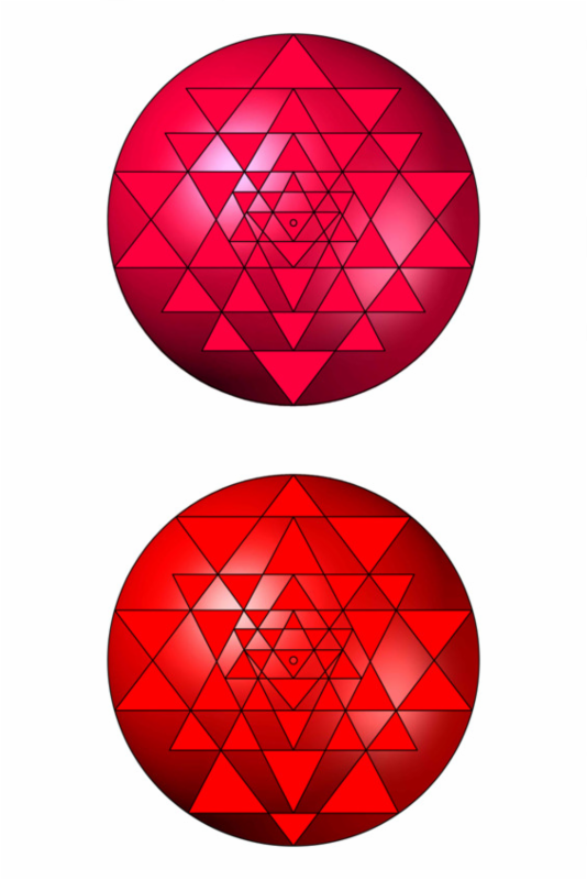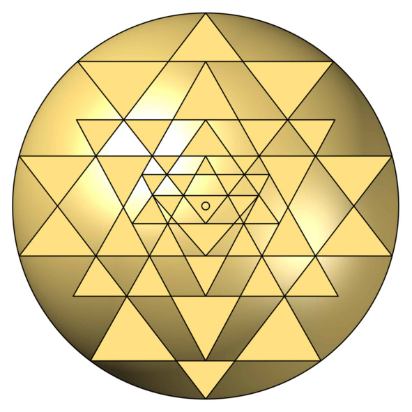 Всем знакомое изображение Шри Янтры из девяти пересекающихся треугольников является плоскостным и двумерным (рис. 1, 3). Представление Шри Янтры в 3D, в трёхмерном объёме, интересная и захватывающая тема. Примеры таких изображений, как традиционные: сферическая и пирамидальная формы, а также другие возможные варианты компоновки из тетраэдров, пирамид и конусов даны в главе «Шри Янтра 3D — объёмные решения», на рис. 9 представлены некоторые из них. Одной или несколькими проекциями, или сечениями предложенных объёмных моделей является традиционное двумерное изображение Шри Янтры одной из моделей.