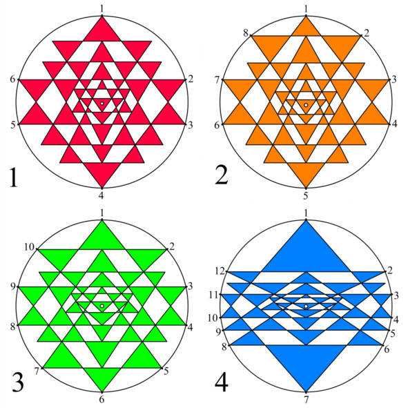Рис. 8. Модели Шри Янтры, классифицированные по количеству вершин треугольников, касающихся окружности: 1 — шесть; 2 — восемь; 3 — десять; 4 — двенадцать