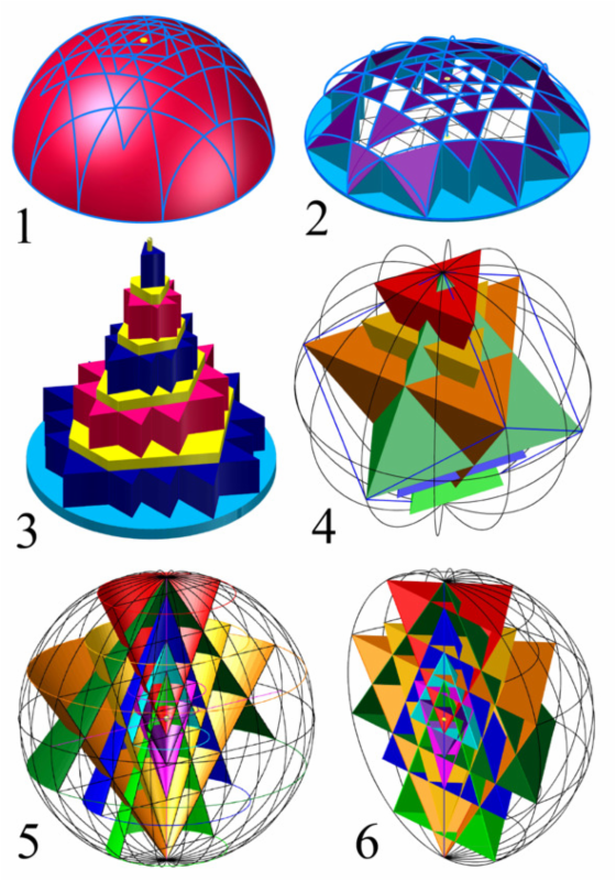 1 — сферическая; 2 — купольная; 3 — пирамидальная (Меру); 4 — из пирамид на базе Меркабы (основание треугольник), 5 — из конусов, 6 — из пирамид (основание квадрат)