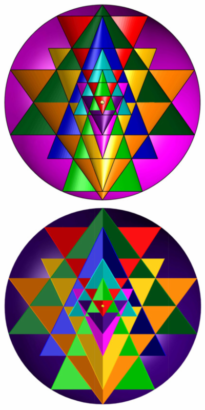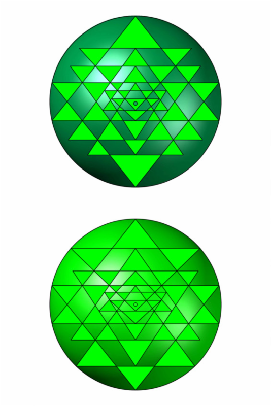 На рис. 10 даны образцы двух проекций, полученных сечением объёмных моделей Шри Янтры, построенных на базе конусов и пирамид. Все треугольники были приняты как проекции сечения конусов или пирамид, задающих размеры объёмных тел, врезанных друг в друга; сечения по оси сферы, в которую они вписаны, дают изумительной красоты картины Шри Янтры.