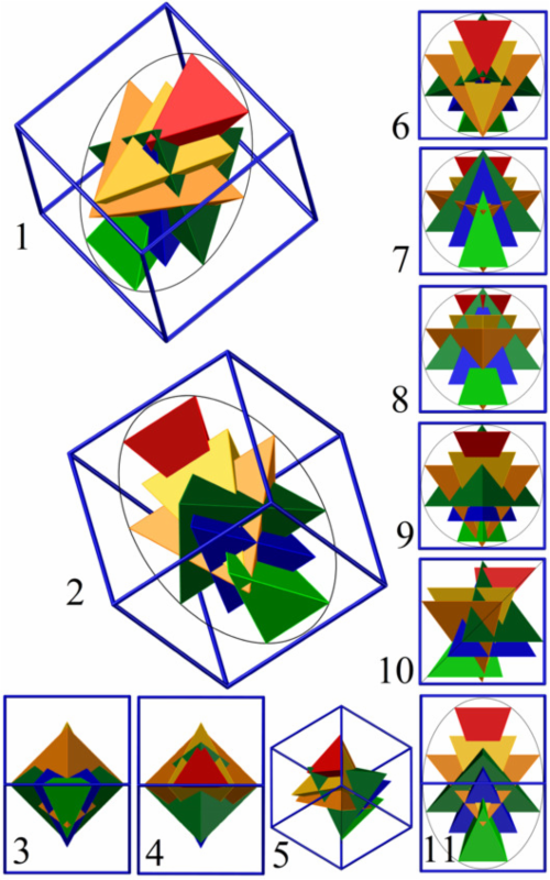 Рис. 11. Объёмная модель Шри Янтры, вписанная в куб, построенная по двум одинаковым линейным проекциям — горизонтальной и вертикальной: 1 — аксонометрия (вид сверху); 2 — аксонометрия (вид снизу); 3, 4 — проекции, параллельные диагональной секущей плоскости куба; 6 — план (вид сверху); 7 — план (вид снизу); 8 — фронтальная проекция (вид спереди); 9 — фронтальная проекция (вид сзади); 10 — вид сбоку; 11 — проекция, параллельная диагональной секущей плоскости куба