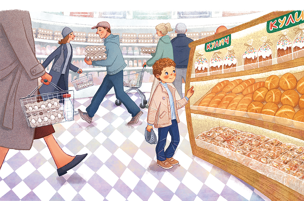 Однажды вечером мальчик с мамой, как обычно, зашли в магазин. Люди толпились в очередях. Точно какой-то переполох! Сёма развёл руками: и дяденьки, и тётеньки с полок выхватывали лотки с белыми яйцами и убегали на кассу. Ещё Сёма заприметил, что в магазине появился необычный хлеб. Мальчик уже умел читать по слогам. И пока мама старалась пробраться сквозь толпу за белыми яйцами, он подошёл и прочитал: «Ку-лич».
