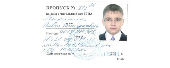 Пропуск в РГИА исследователя П. Д. Никитина