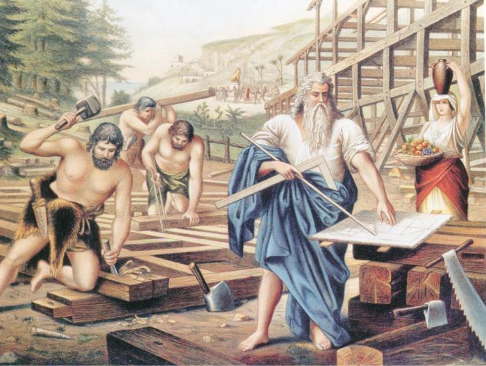 Он велел Ною построить ковчег, то есть большой крытый корабль, войти в него со своим семейством и взять с собою всяких животных.