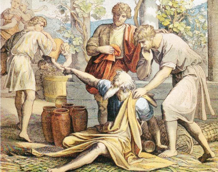 После потопа Ной стал обрабатывать землю и насадил виноградник. Когда виноград поспел, он выжал из него сок и, не зная, что сок этот опьяняет, выпил его слишком много. Потом он лёг, не прикрывшись, в своём шатре и уснул.
