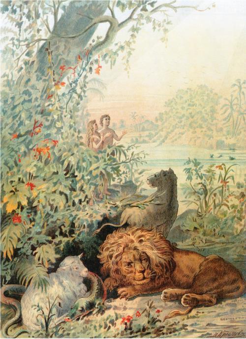 Первые люди блаженствовали в раю. Все животные ласкались к ним; не боялись они смерти, не знали болезней, горя, страданий, не знали лжи и обмана и всей душой любили Бога, Который постоянно заботился о них и часто являлся им и беседовал с ними.