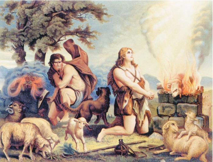 Старший, Каин, обрабатывал землю; младший, Авель, пас овец. Авель отличался добротой и кротостью; Каин же был злой и завистливый. Однажды оба брата захотели принести Богу в жертву, то есть в дар, что было у них лучшего: Каин – от плодов земных, Авель – лучшую овцу из своего стада. Авель приносил свою жертву с чистым сердцем, с чувством горячей любви, и жертва его была угодна Богу, Каин же приносил свою жертву без благоговения, а потому даров его Господь не принял.