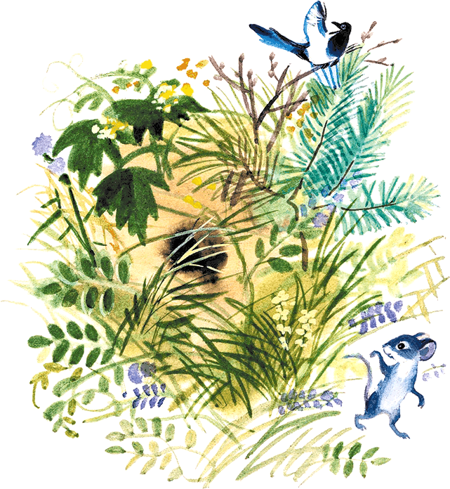 – Жил Дятел пёстрый – нос вострый, жил Скворец – первый в роще певец, жил Сыч – попадёшь ему в когти – не хнычь, жила Белка – по веткам скакалка, по дуплам сиделка, теперь я живу – Куница – всех малых зверей убийца. А вы кто?