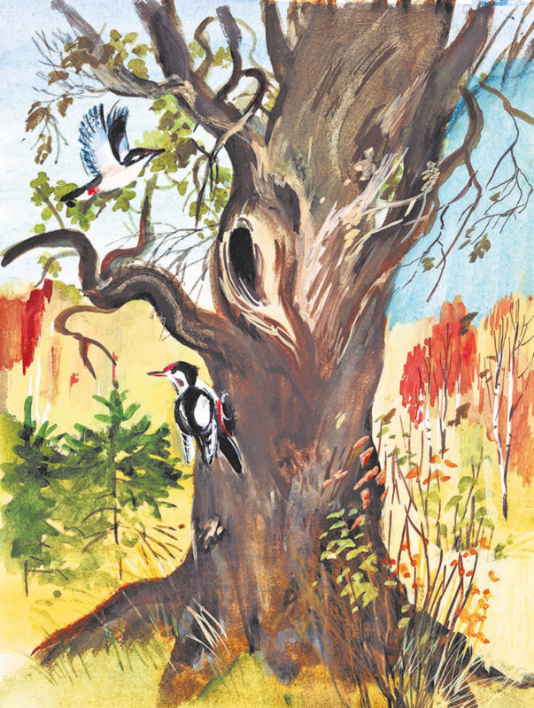 По стволу скок-поскок, носом стук-постук – выстукал, выслушал и давай дырку долбить. Долбил-долбил, долбил-долбил – выдолбил глубокое дупло. Лето в нём пожил, детей вывел и улетел.