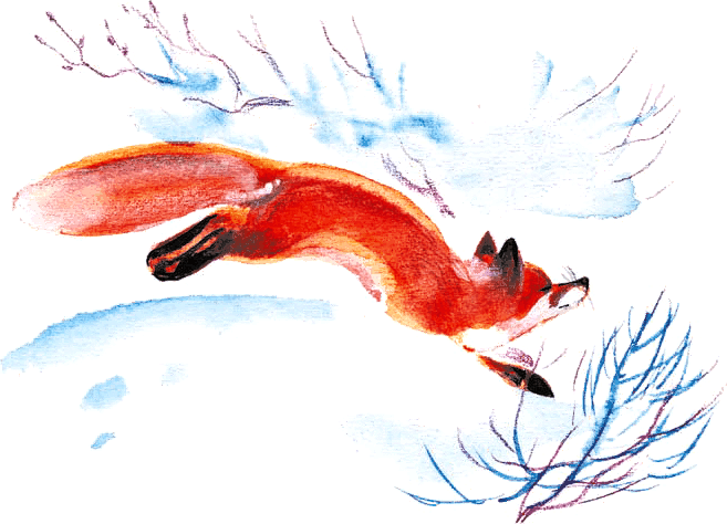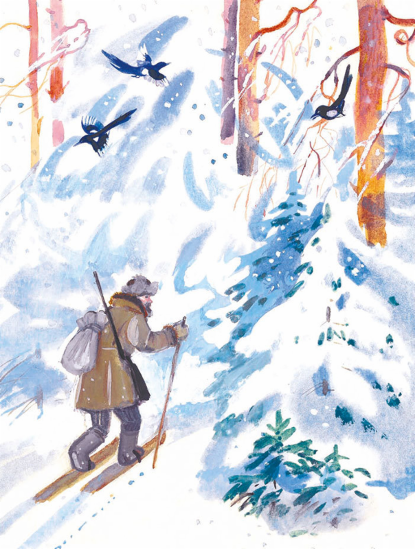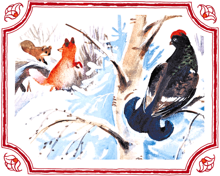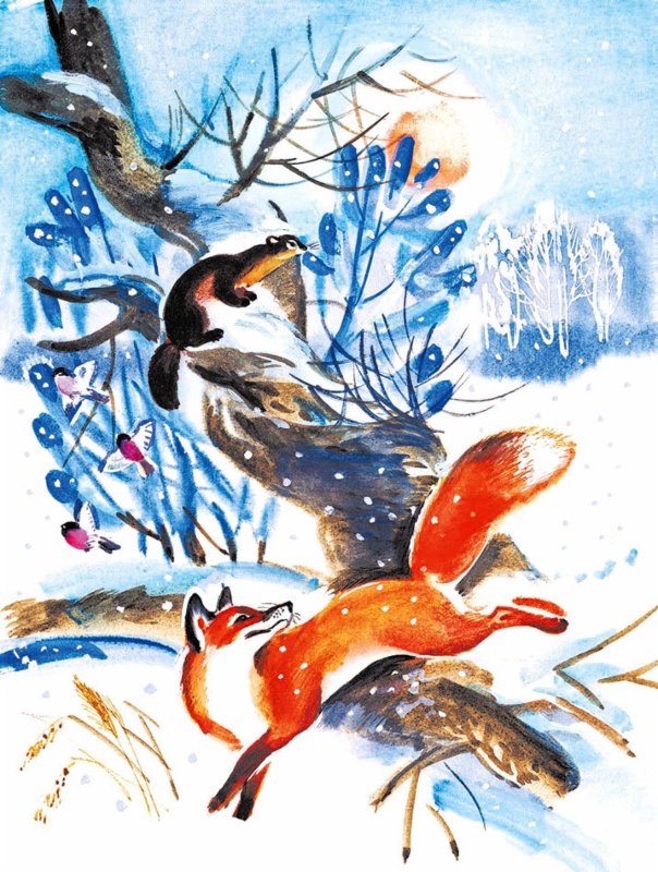 Терентий во сне ноги-то поджал да бух с ветки! А снег был глубокий, мягкий как пух. Неслышно по нему крадётся Лисица. К опушке бежит. А поверху, по веткам, Куница скачет и тоже к опушке. Обе за Терентием-Тетеревом спешат.