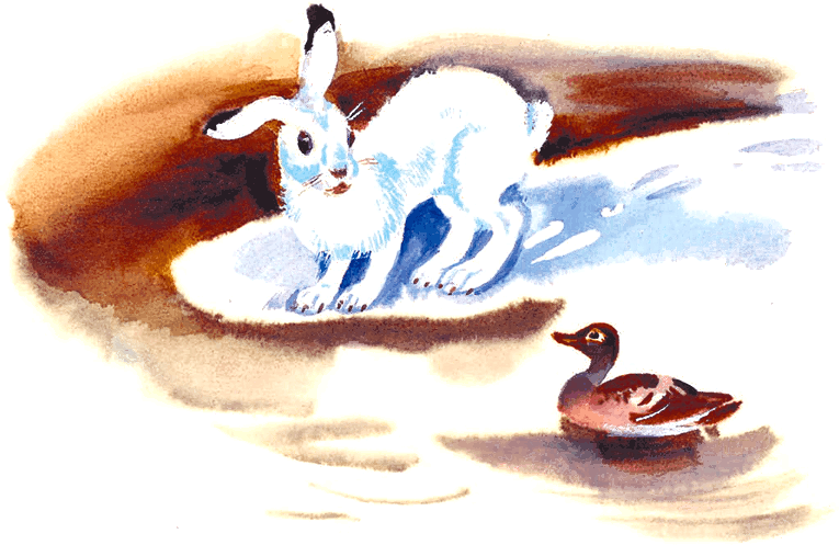 По всей вероятности, Лиса и съела бы Серую Шейку, когда полынья замёрзла бы совсем, но случилось иначе. Заяц всё видел своими собственными косыми глазами.