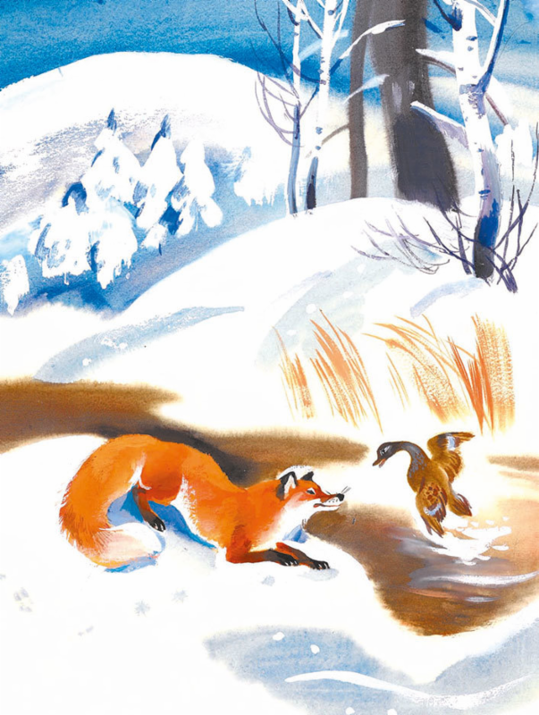Лиса начала приходить каждый день – проведать, не застыла ли полынья. Наступившие морозы делали своё дело. От большой полыньи оставалось всего одно окно в сажень величиной. Лёд был крепкий, и Лиса садилась на самом краю. Бедная Серая Шейка со страху ныряла в воду, а Лиса сидела и зло подсмеивалась над ней: