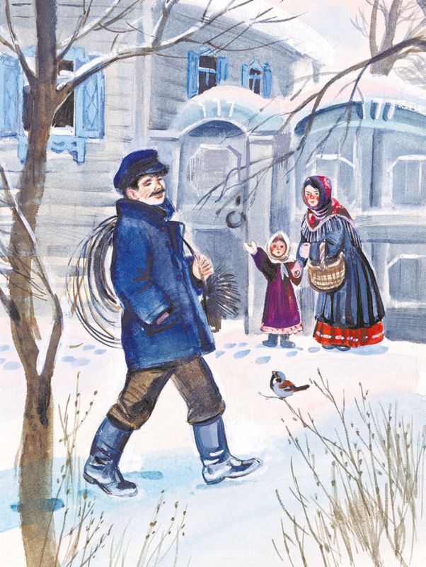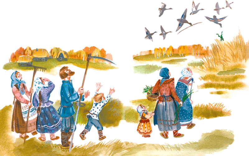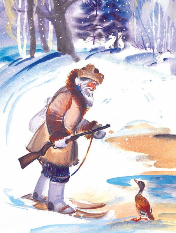 Старичок добыл Серую Шейку из полыньи и положил за пазуху. «А старухе я ничего не скажу, – соображал он, направляясь домой. – Пусть её шуба с воротником вместе ещё погуляет в лесу. Главное: внучки вот как обрадуются…»