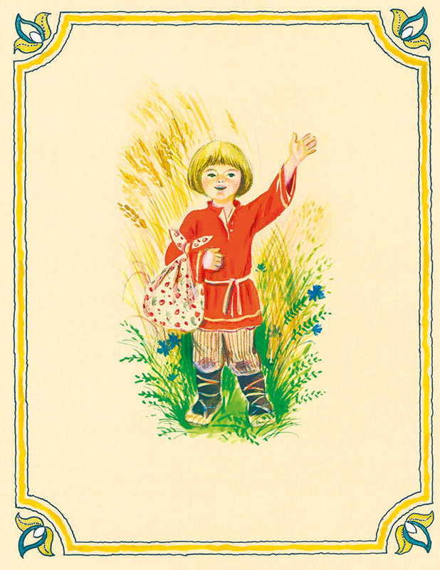 Старуха завязала блины в узелок и дала сыночку. Липунюшка взял узел и побежал в поле.