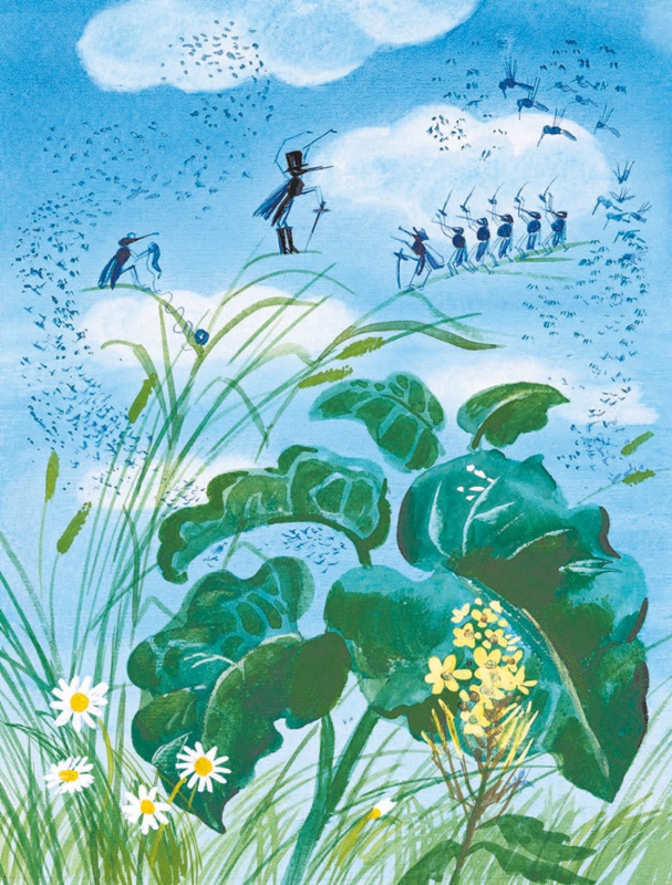 Старичок пустился разыскивать зайцев по следам, но зайцы рассыпались по лесу, как горох. Старичок порядком измучился, обругал лукавых зайцев и присел на берегу реки отдохнуть.