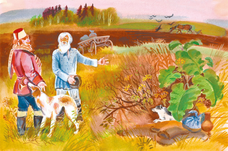 Ехал мимо этого поля барин и увидал, что старик сидит завтракает, а лошадь одна пашет. Барин вышел из кареты и говорит старику: