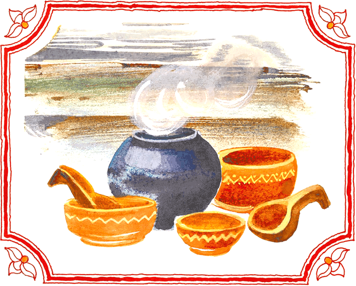В домике было две комнаты: одна столовая, другая спальня. Девочка вошла в столовую и увидела на столе три чашки с похлёбкой. Первая чашка, очень большая, была Михайлы Иванычева. Вторая чашка, поменьше, была Настасьи Петровнина, третья, синенькая чашечка, была Мишуткина. Подле каждой чашки лежала ложка: большая, средняя и маленькая.